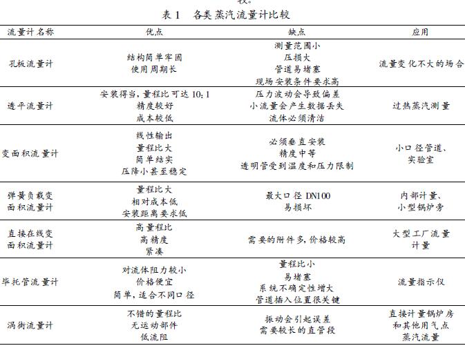 目前在工業上使用的流量計的類型非常多,其中適合蒸汽流量測量的流量計既有其優點,也有使用上的缺點。為確保蒸汽流量計的性能和精度,*重要的是選用的流量計要符合所使用的工況。表1對各類蒸汽流量計的優缺點和應用情況進行了比較。