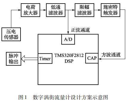 本文設計的基于 TMS320F2812 DSP 的數字管道壓縮空氣流量計的信號處理系統由前置放大電路和數字信號處理電路兩部分組成。本文選用的前置放大電路即為目前被廣泛應用的普通管道壓縮空氣流量計的前置放大電路,主要由電荷放大電路、低通濾波電路、限幅濾波電路和施密特觸發電路組成; 對于經壓電傳感器測得的渦街信號采用了頻域分析和時域分析相結合的方式,即由前置放大電路和數字信號處理電路相配合。時域分析通道利用 DSP 事件管理器的捕獲模塊,對前置放大電路輸出的方波進行頻率計算,然后再由 DSP 事件管理器通用定時器的比較輸出模塊進行脈沖輸出。頻域分析通道即 DSP對低通濾波電路輸出的疊加了許多噪聲的正弦信號進行 A/D 采樣,再利用 DSP 對 A/D 采樣的結果進行頻譜分析,從而得出此時渦街信號的頻率,*后由 DSP 通用定時器的比較輸出模塊進行脈沖輸出。系統設計方案示意圖如圖 1 所示。