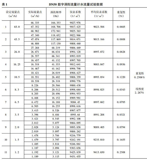 將本文實現的數字管道壓縮空氣流量計在上述 50mm 口 徑( 簡稱 DN50) 的水流量試驗裝置上進行試驗。先在其正常流量范圍內進行試驗,流量從大到小逐漸降低,之后不斷探求其所能測量的*小流量。每個流量點試驗三次,計算其重復性、平均儀表系數和線性度。水流量試驗數據如表 1 所示。