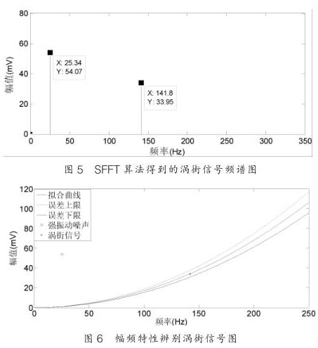 從圖 5 可以看出 SFT 算法能夠很好恢復,對渦街信號的頻率恢復沒有誤差,而幅值的誤差不超過 1% ,這對含有強振動噪聲的渦街信號精確測量至關重要;圖 6 是經 SFT 頻譜分析所得到的數據通過幅頻特性曲線來辨別是噪聲信號還是渦街信號。通過幅頻關系的信號處理方法可以從含有振動的混合信號中識別渦街信號,從而達到提高蒸汽管道流量表抗振動性能的目的。