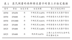 目前,國內*三方標定僅有開封**水大流量計量站能標定口徑達1.6m的大管徑蒸汽流量計,可以提供1.6m及以下全口徑檢定**。部分用于蒸汽測量的西斯特流量計的*三方檢定數據如表1所示。