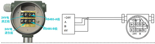 帶RS-485通訊功能的渦街流量計采用DC24V電源供電,與其它設(shè)備之間采用四線制傳輸方式。儀表端子接線見圖