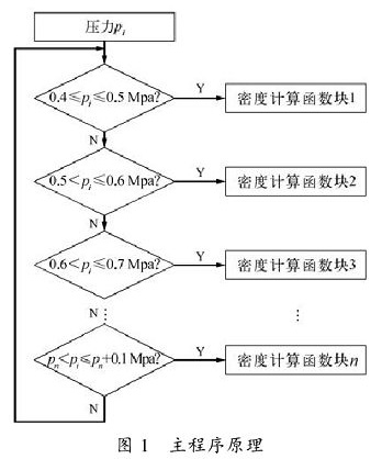 定義密度計算程序是蒸汽壓力0.4~0.5MPa的一個函數,以相同的方法定義0.5~0.6MPa,0.6~0.7MPa,一直到0.9~1MPa等若干個函數,這里不再重復。通過對壓力值范圍的判斷調用相應的函數,就可以得到較為準確的密度值。程序框圖如圖1,圖2所示,pi為蒸汽壓力,ti為蒸汽溫度。