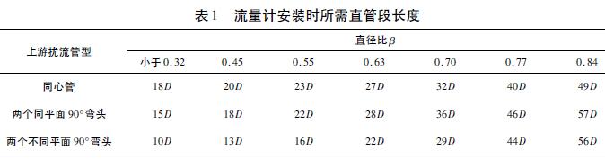 差壓式流量計中常用的有孔板流量計和新型V錐流量計兩種型式。孔板流量計以簡單結實、成本低廉及無需額外標定等優勢在工業中獲得廣泛應用。但它也有自身的缺點:受限于工作原理,量程比限制在3:1~5:1;在水錘作用下,孔板會變形,如果設計或安裝不當甚至會堵塞管道;孔板的直角邊緣在長期運行后會磨損,特別是在進行蒸汽介質測量時會改變孔板特性,影響測量精度,因此必須對孔板進行周期檢查并予以更換;孔板流量計一般需要較長的直管段以保證精度,表1給出了不同直徑比β和不同上游擾流布置情況下所建議的直管段長度。