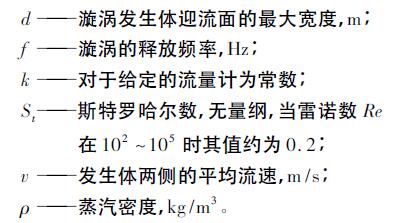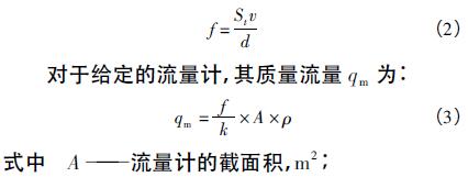 流體流經設置在管道內的漩渦發生體時會產生流動振蕩,在發生體的兩側交替產生規則漩渦,測定其振蕩頻率可以反應流量的大小。當工況條件合適時,漩渦頻率f和流體速度v成線性關系,且與密度無關,可表示為: