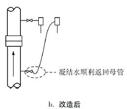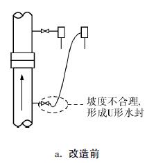 用差壓流量計測量蒸汽流量,為保護差壓變送器的高低壓室,通常設置兩個冷凝罐,兩個冷凝罐內液位高度相等是壓差信號不失真傳遞的關鍵。如果發現一個冷凝罐是冷的,罐的上部必定不是蒸汽,造成這種情況的原因有多種,如:導壓管堵、根部閥堵、溢流口高度比取壓口低、在取壓口和冷凝罐之間存在液封等。不管是哪種原因,都將使差壓變送器接收到的壓差與節流件送出的壓差信號不相等,進而引起流量測量誤差。如圖1所示,改造前到正壓冷凝罐的引壓管由于安裝坡度不合理形成U形水封,這段管內的冷凝水不能靠重力流回母管,從而造成流量示值偏低。配置和安裝合理的壓差裝置后,蒸汽從母管經導壓管流入冷凝罐,放出熱量后變成凝結水,罐中液位高于溢流口后自動返回母管,從而保證兩個罐中的凝結水液位相等。