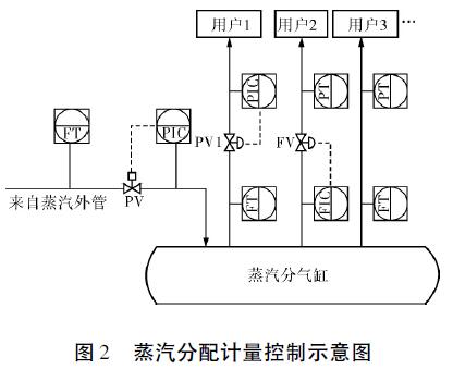 渦街流量計經常與調節閥安裝在同一根管道上以控制流量或壓力。如圖2所示,來自鍋爐的蒸汽總管經壓力控制回路調節后進入蒸汽分氣缸并根據用戶負荷測量總蒸汽用量,分氣缸分配到各用汽設備或裝置,同樣安裝有壓力或流量調節控制回路。
